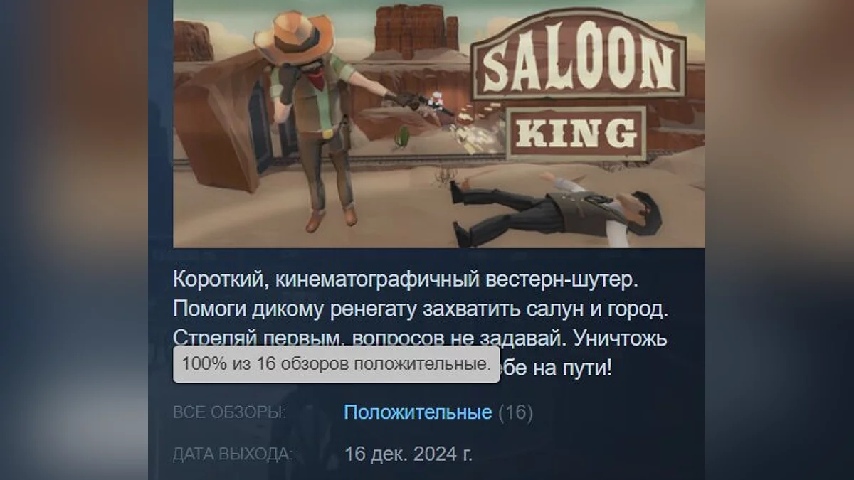 Saloon King — простенький вестерн-шутер, де потрібно допомогти дикому ренегату захопити салун і місто. Проект отримав 100% позитивних відгуків. Сторінка в Steam.