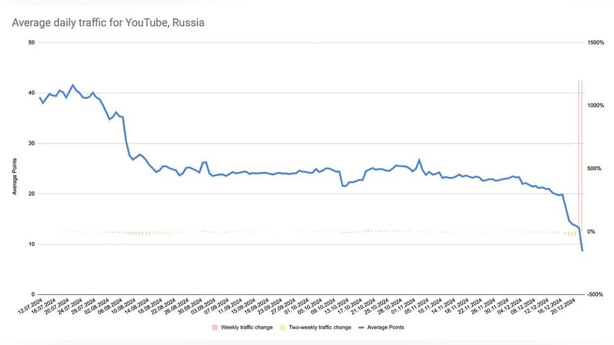 Трафік YouTube в Росії впав до 20% від звичайного стану до «уповільнення», повідомив автор Telegram-каналу «ЗаТелеком». За словами експерта, це може означати повну блокировку сервісу.