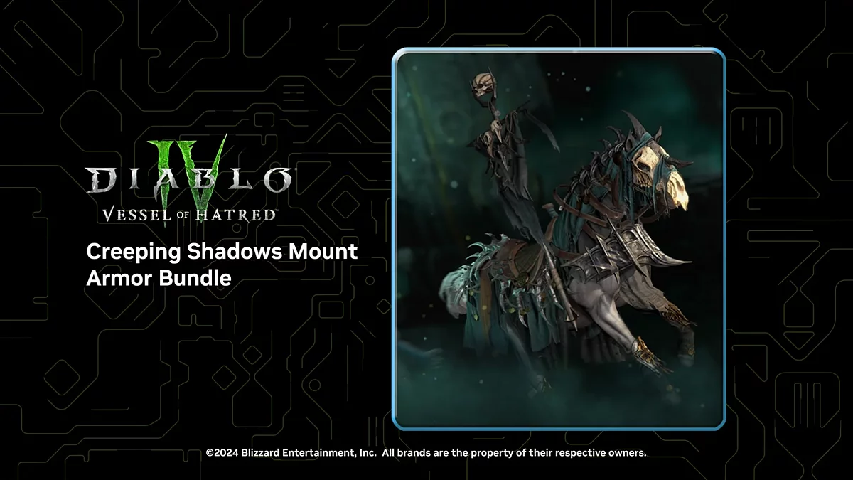 - Diablo 4 — комплект броні для їздової тварини Creeping Shadows;