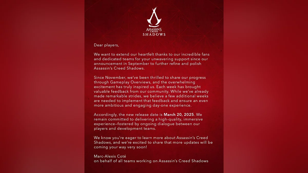 Ubisoft повідомила про чергове перенесення Assassin's Creed: Shadows. Цього разу реліз відсунули з 14 лютого до 20 березня. Компанії потрібно додатковий час на розробку гри.
