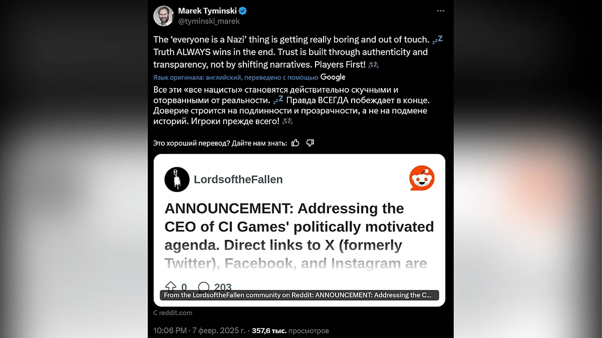 Незважаючи на те, що сталося, HEXWORKS і CI Games залишаються вірними своєму принципу пріоритету думки гравців. Розробники підкреслили намір продовжувати курс на активну взаємодію зі співтовариством, ігноруючи політичні диспути окремих майданчиків. В найближчий час очікується випуск сиквела «Lords of the Fallen», де врахують ще більше побажань і уподобань геймерів.