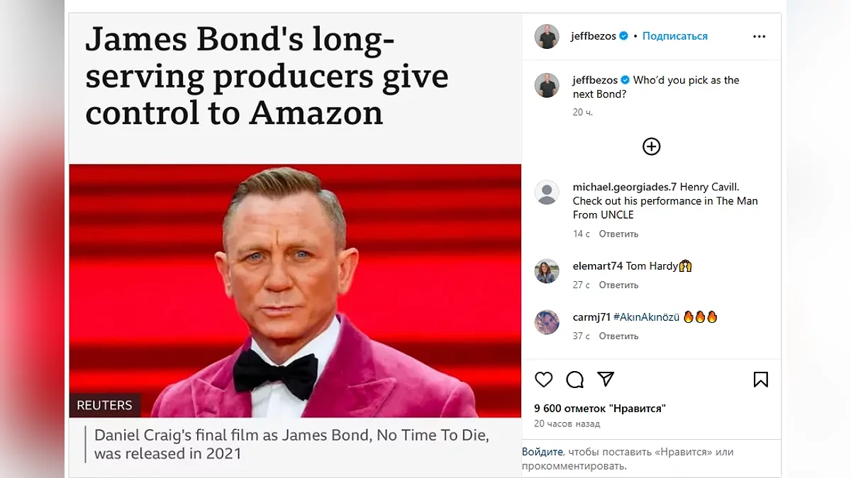 Засновник Amazon виклав пост в соцмережах з новиною про те, що його компанія тепер повністю володіє «бондіаною», і заодно влаштував опитування підписників. Більшість коментаторів виступили за кандидатуру Генрі Кавілла (Henry Cavill):
