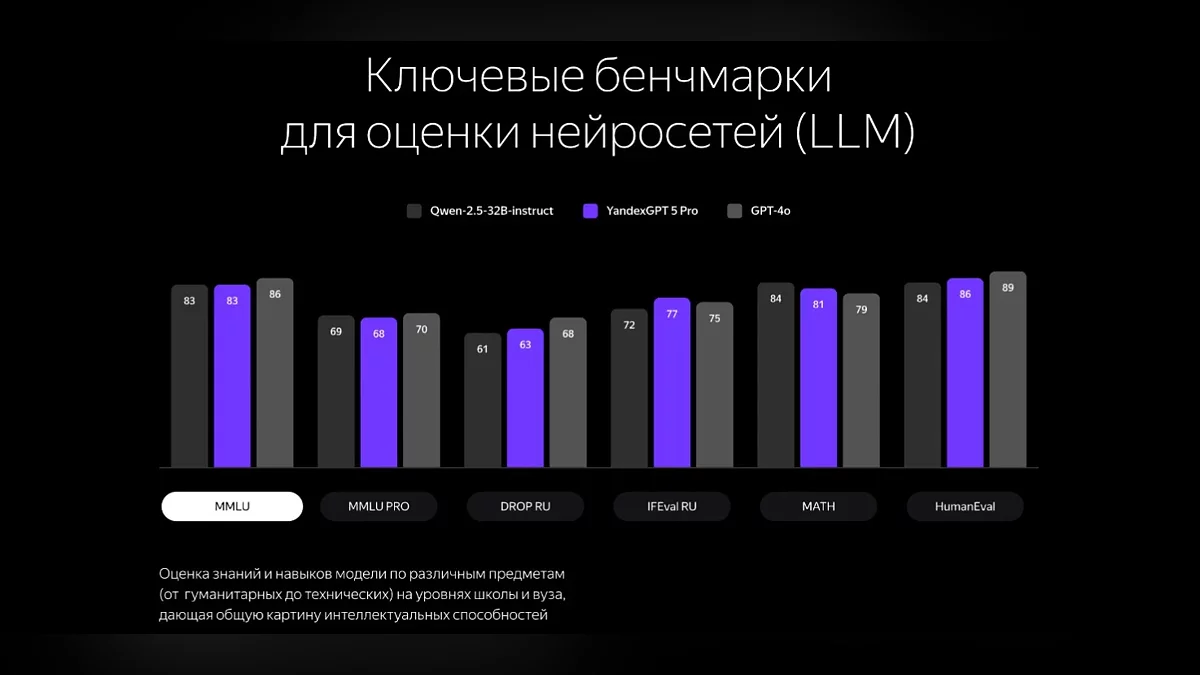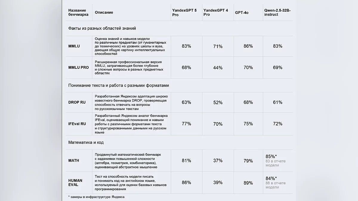 Згідно внутрішнім тестам Яндекса, YandexGPT 5 Pro в 64% випадків перевершує китайський аналог Qwen2.5, особливо в фактологічній точності та дотриманні формату, трохи поступаючись лише в математичних розрахунках. У сліпих порівняннях з GPT-4o модель демонструє паритет, а в креативних завданнях — випередження. Яндекс тимчасово зняв обмеження, щоб кожен міг оцінити потужність YandexGPT 5 Pro. Для цінителів «чистого» ІІ в чаті доступний режим без функцій асистента — тут нейромережа відповідає виключно на основі своїх знань.
