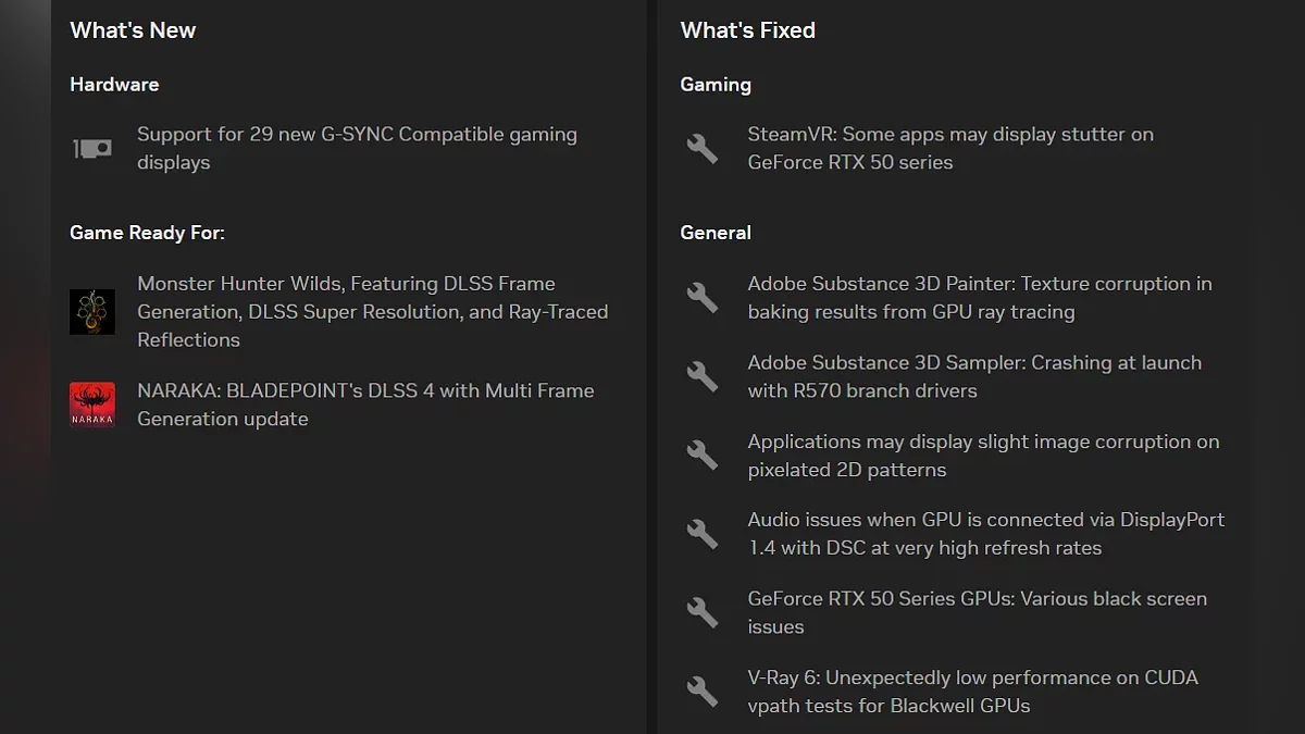 - Додана підтримка Monster Hunter Wilds з функціями DLSS Frame Generation, DLSS Super Resolution та Ray-Traced Reflections;