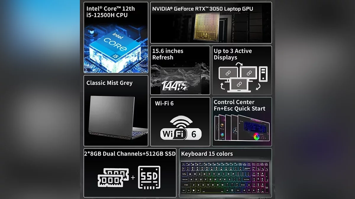 Основою пристрою став процесор Intel Core i5-12500H (Alder Lake) з 12 ядрами і частотою до 4.5 ГГц. Його гібридна архітектура розподіляє задачі між продуктивними та енергоефективними ядрами, що оптимізує роботу як в іграх, так і в багатозадачних сценаріях. У парі з ним працює відеокарта NVIDIA RTX 3050, здатна забезпечити комфортний гейминг на середніх налаштуваннях у розширенні Full HD. Для динамічних сцен передбачений дисплей з частотою оновлення 144 Гц, що робить ноутбук привабливим для любителів шутерів і гоночних симуляторів.