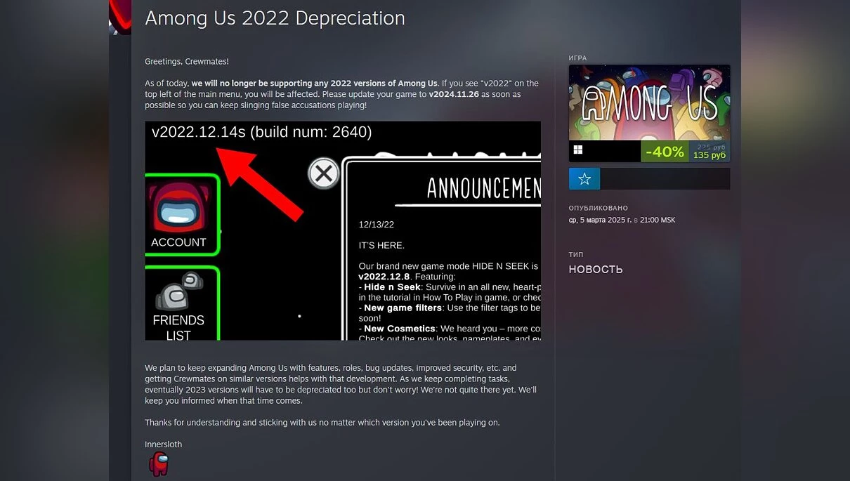 Розробники Among Us оголосили про важливі зміни в підтримці гри, які можуть суттєво вплинути на ігровий досвід користувачів. З 5 березня 2025 року повністю припиняється підтримка всіх версій гри, випущених у 2022 році та раніше. Це означає, що гравці, які використовують версії з префіксом «v2022» у головному меню, зіткнуться з серйозними обмеженнями в ігровому процесі.