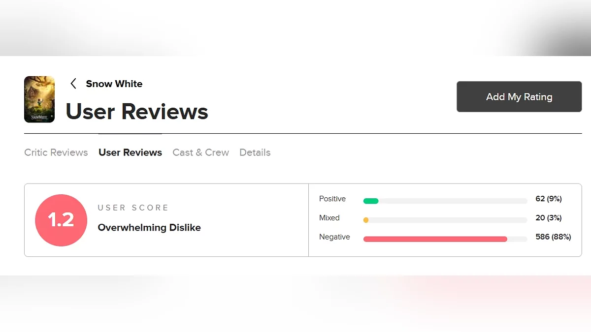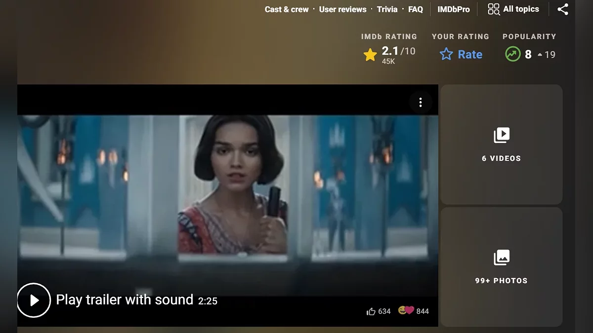 На момент написання новини середня оцінка «Білосніжки» на IMDb становить 2,1 бала.