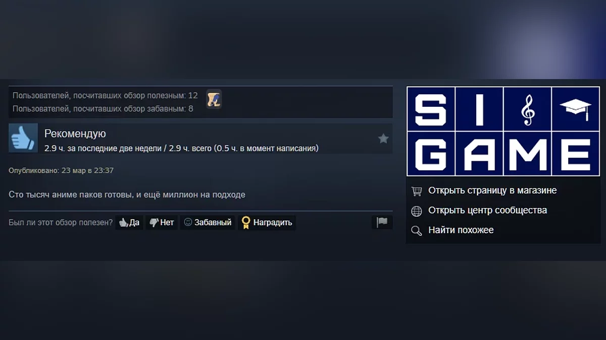 Steam-версія вже отримала 109 відгуків з рейтингом 91%. Якщо ви вже грали в «Свою гру», то навряд чи здивуєтеся коментарям — вони майже повністю присвячені творцеві вікторини та запитанням про аніме.