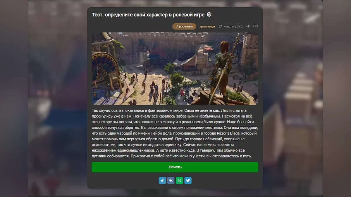 Тест «Визначте свій характер у рольовій грі» авторства gooranga став найкращим за підсумками змагання! Ми, як і інші користувачі, оцінили такий комплексний підхід до розробки, що включає в себе цілу сюжетну лінію з цікавими моральними виборами та закінченням. Від усієї душі вітаємо учасника — з вами скоро зв’яжуться, щоб передати головний приз.
