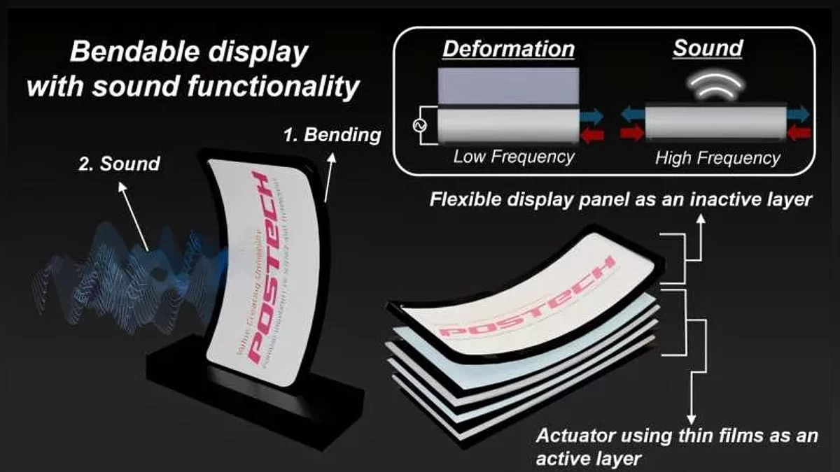 Учені з Південної Кореї здійснили прорив у галузі гнучкої електроніки, створивши OLED-екран, здатний не лише змінювати форму без механічних елементів, але й генерувати звук. Команда розробила ультратонку панель на основі п'єзополімерного актуатора. Цей матеріал, реагуючи на електричні сигнали, дозволяє дисплею приймати складні конфігурації — від хвиль і S-подібних вигинів до опуклих форм. При цьому для трансформації не потрібні шарніри, мотори або слайдери, що зберігає мінімалістичний профіль пристрою.