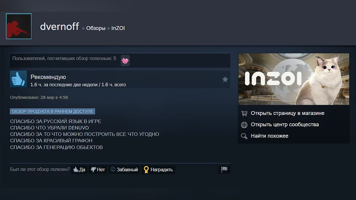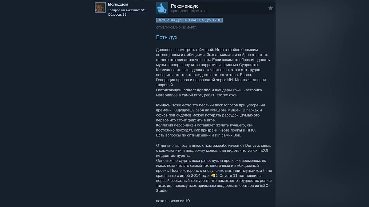 Багато гравців солідарні у думці, що у inZOI є величезний потенціал. До плюсів відносять наявність ІІ-функцій і велику кількість налаштувань. До мінусів деякі геймери відносять хіба що не найкращу оптимізацію.