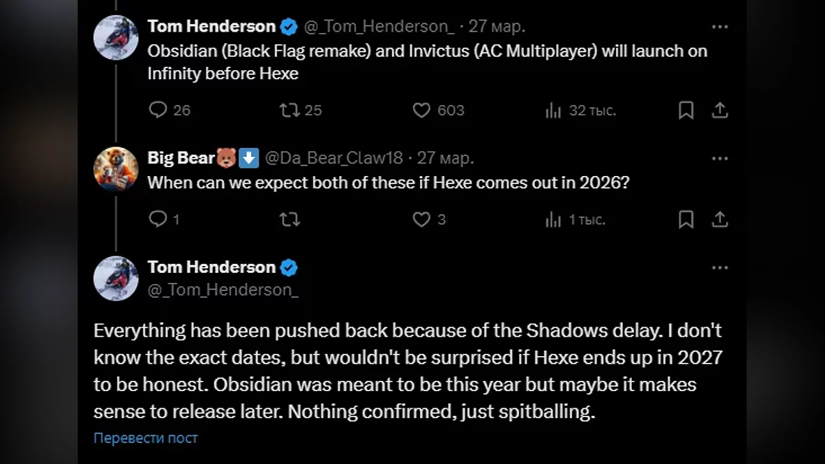 Він знову зазначив, що через перенесення релізу Shadows компанії довелося переглянути свій календар. Ремейк Black Flag (кодова назва Obsidian) можуть випустити в 2026 році до виходу Assassin's Creed: Codename Hexe — нової сюжетної частини про відьом, реліз якої інсайдер очікує в 2027 році.