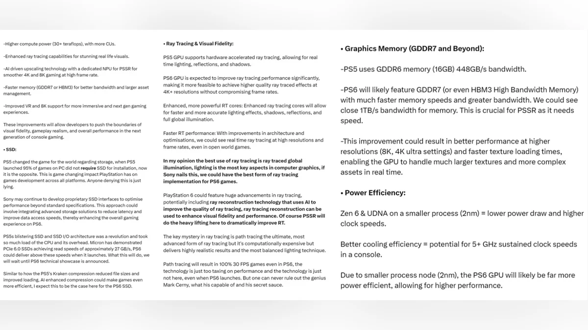 Основою консолі стане чип AMD, створений за 2-нанометровим процесом TSMC, виробництво якого, як стверджується, стартує вже в цьому році. Процесор Zen 6 з 12 ядрами та 24 потоками, який працює на частоті до 5 ГГц, отримає модернізований 3D V-Cache, що підвищить продуктивність на 70% у порівнянні з Zen 2 в PS5. Графічна система на архітектурі UDNA, що має 60 обчислювальних блоків (CU) з частотою понад 3.5 ГГц, забезпечить потужність більше 30 TFLOPS. PS6 зможе не лише запускати ігри в нативному 8K, але й запропонує просунутий апскейлінг через ІІ-алгоритми, які перевершують сучасні технології. В якості відеопам'яті розглядаються GDDR7 або HBM3, що гарантує миттєве завантаження та деталізацію світів.