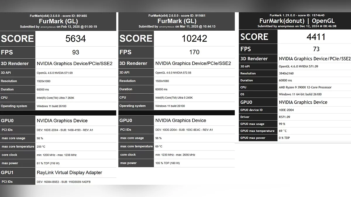 Ентузіасти виявили в базі Furmark запис з ідентифікатором пристрою 10DE-2D04, який пов'язують з GPU GB206 — основою для RTX 5060 Ti. Тест показав результат у 10 242 бали, що практично збігається з показниками RTX 4060 Ti. Однак Furmark, як інструмент, більше орієнтований на оцінку тепловиділення, а не ігрової продуктивності. До того ж, тестування проводилося на ранніх драйверах, що могло вплинути на підсумки.