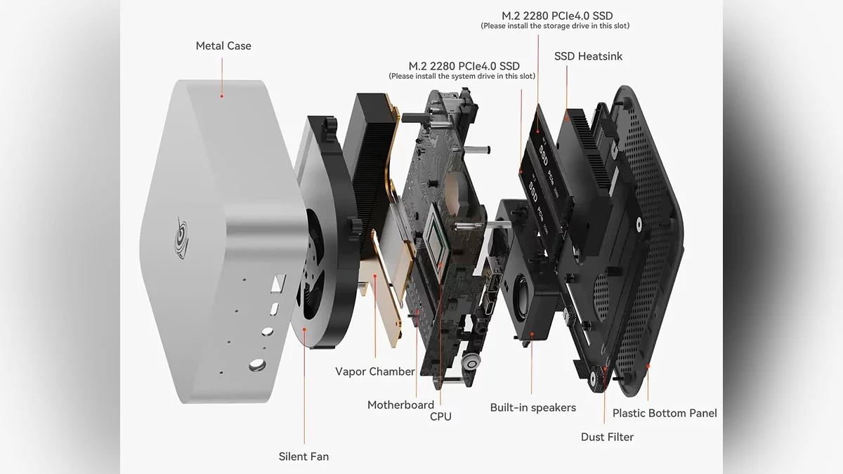 SEi13 Pro виділяється системою охолодження MSC 2.0: повітрозабірник знизу корпусу та металевий пиловий фільтр забезпечують тиху роботу (до 32 дБ) навіть під навантаженням. У конфігурації за замовчуванням пристрій оснащений 32 ГБ двоканальної пам'яті LPDDR5 та SSD на 1 ТБ, але користувачі можуть розширити сховище до 8 ТБ через два слоти NVMe.