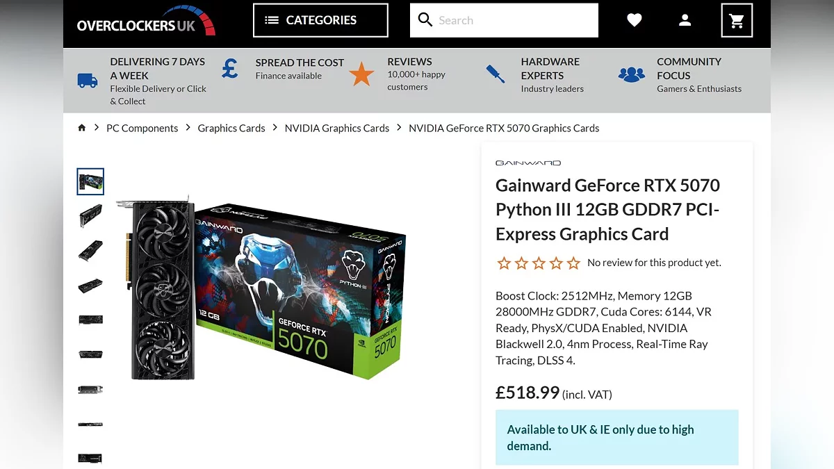Спочатку RTX 5070 у Великобританії коштувала від 539 фунтів (близько 58 000 рублів), але зараз в асортименті магазину з'явилися варіанти за більш доступними цінами. Наприклад, версія Gainward Python III тепер доступна за 519 фунтів (близько 56 000 рублів) — це на 20 фунтів менше початкової вартості. Інші моделі того ж прискорювача пропонуються за 529 фунтів. Тенденція поширюється й на інші європейські країни. У Німеччині рітейлер MindFactory також знизив ціну. Це перше значне падіння вартості карти в регіоні з моменту її старту.