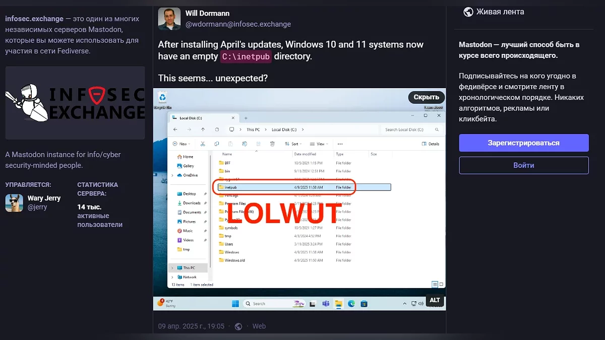 Першим про знахідку повідомив Уілл Дорманн (Will Dormann) на форумі Mastodon, що спеціалізується на пошуку вразливостей. Дана папка пов'язана з «Інформаційними службами Інтернету» (IIS) від Microsoft — досить суперечливою платформою, повідомляє Tom's Hardware. Вона дозволяє розгортати прямо на PC програми, веб-сайти та сервіси до їх запуску, однак має ряд вразливостей і часто піддається хакерським атакам. У примітках до оновлень KB5055523 для Windows 11 та KB5055518 для Windows 10 не вказано, з якою метою була додана дана папка.