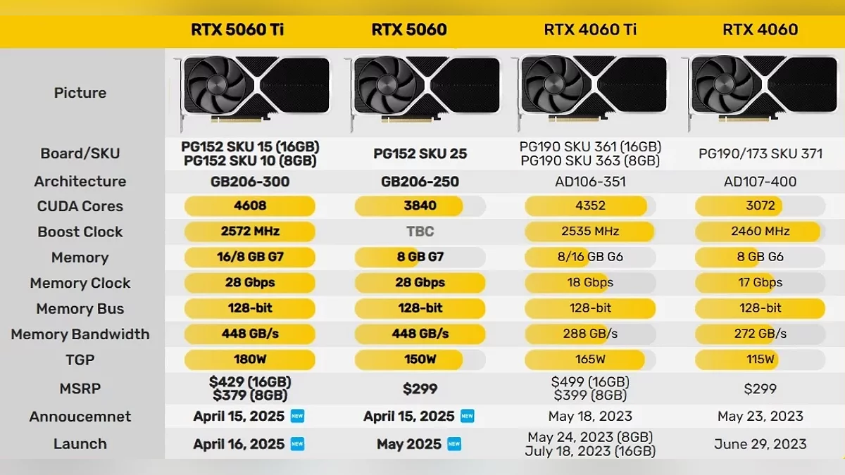 Старша модель, RTX 5060 Ti, основана на чіпі GB206-3000 і буде випущена в двох модифікаціях: з 8 ГБ і 16 ГБ пам'яті GDDR7. Обидві версії отримали ідентичні характеристики: 4608 ядер CUDA, базова частота 2572 МГц та енергоспоживання 180 Вт. Різниця полягає лише в обсязі VRAM і ціні. Молодша версія обійдеться в $379, а старша в $429 (приблизно 31 000 і 36 000 гривень відповідно). Продажі стартують 16 квітня.
