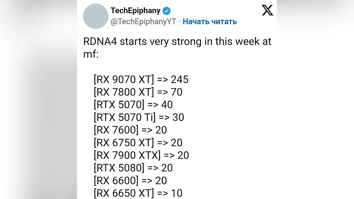 Аналітик TechEpiphany повідомляє, що за сім днів було продано 245 одиниць RX 9070 XT. Для порівняння: NVIDIA RTX 5080, позиціонована як субфлагман, розійшлася тиражем всього 20 екземплярів, а більш доступна RTX 5070 — 40. Це вказує на зростаючий інтерес до продукції AMD, особливо на фоні проблем конкурента з логістикою та ціновою політикою.