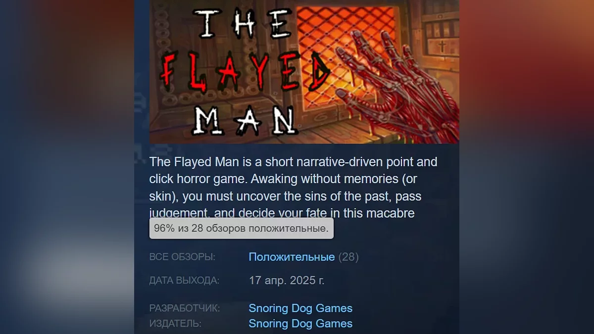 The Flayed Man — короткий хорор-квест з двомірною піксельною графікою і різними закінченнями, де потрібно досліджувати похмурий особняк. Проект отримав 96% рейтингу. Сторінка в Steam.