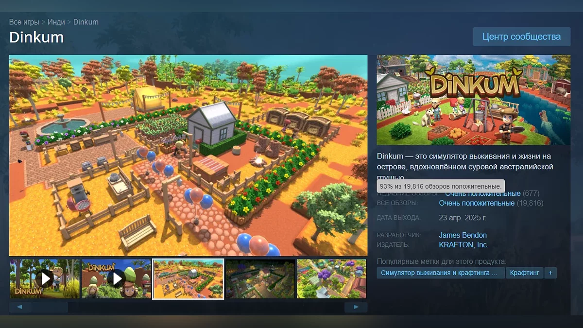 В Steam відбувся вихід повної версії (1.0) симулятора життя Dinkum, який близько трьох років перебував у ранньому доступі. На даний момент проект має рейтинг 93%, що базується на 19,8 тис. користувацьких оглядів.