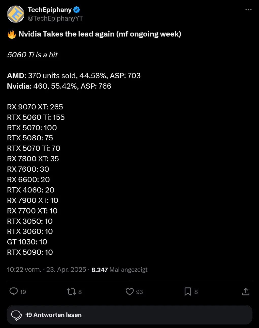 За сім днів було реалізовано 460 графічних прискорювачів NVIDIA проти 370 у AMD. Лідером залишилася Radeon RX 9070 XT (265 екземплярів), однак наступними в списку виявилися виключно карти NVIDIA: RTX 5060 Ti (155 шт.), RTX 5070 (100 шт.), RTX 5080 (75 шт.) і RTX 5070 Ti (70 шт.). Примітно, що навіть застаріла GT 1030 знайшла покупців, що рідко зустрічається в сегменті нових GPU.