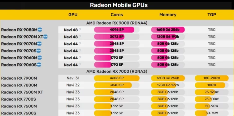 Згідно з інформацією інсайдерів, флагманом серії стане RX 9080M, побудована на архітектурі RDNA4 з 64 обчислювальними блоками, що еквівалентно 4 096 потоковим процесорам. Ця відеокарта отримає 16 Гб відеопам’яті і стане найпродуктивнішою в лінійці. Наступною йде RX 9070M XT, оснащена 48 CU і 12 Гб пам’яті, що робить її мобільним аналогом нещодавно представленої RX 9070 GRE. Інші очікувані моделі включають RX 9070M, 9070S, 9060M і 9060S, з кількістю ядер від 2 048 до 1 792 і обсягом відеопам’яті від 8 Гб.
