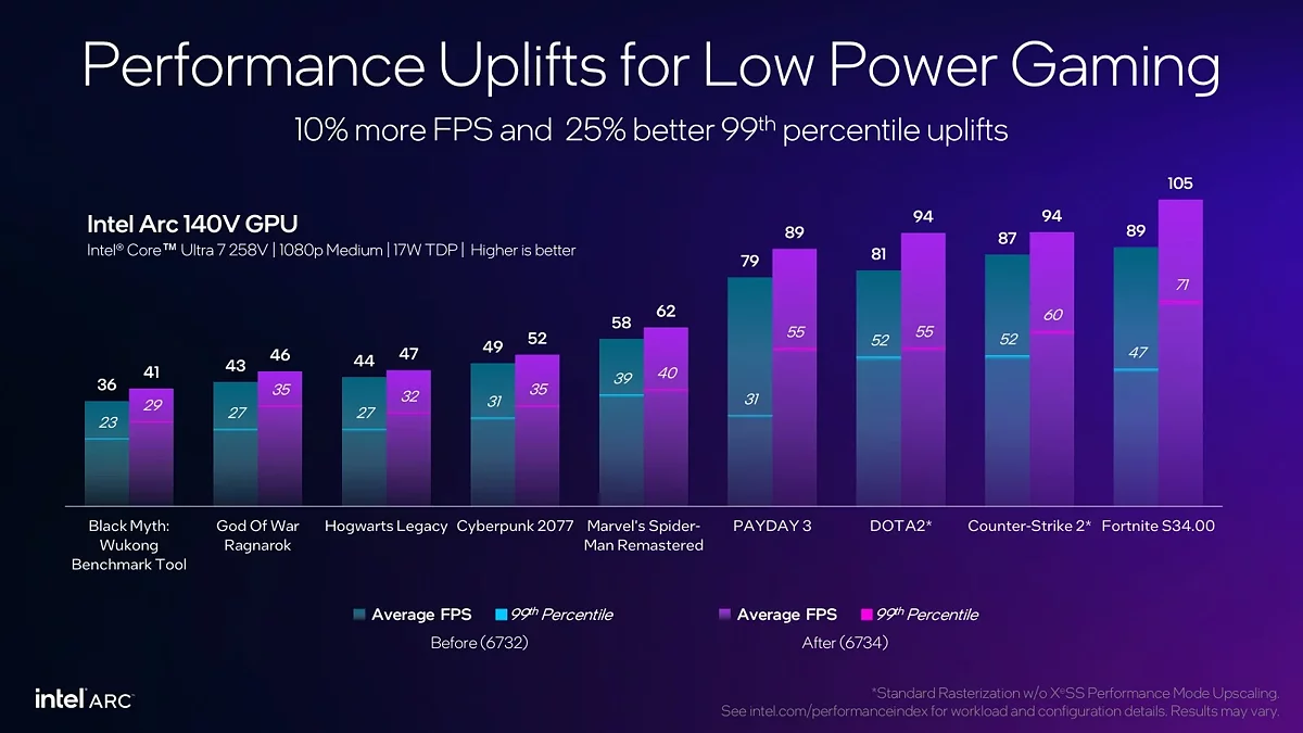 Експериментальні процесори Lunar Lake, які Intel називає «унікальним проєктом», відрізняються вбудованою пам'яттю та нейропроцесором, що відповідає вимогам Copilot+. Їх графічні ядра Arc 130V і 140V тепер працюють ефективніше завдяки оптимізаціям у драйвері 32.0.101.6734. Тести на пристрої MSI Claw 7 AI+ показали, що середній FPS у іграх зріс на 10%, а мінімальні показники (1% Low) покращились на 25%, що зменшує помітні підтормажування.