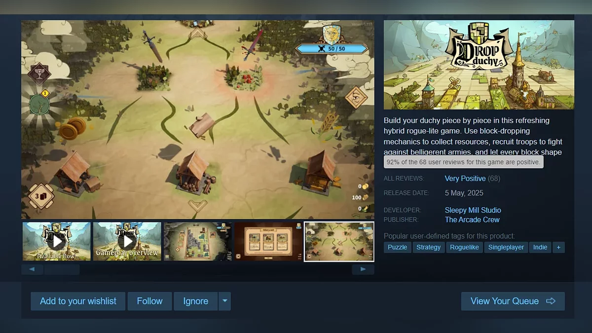 Компанія-видавець The Arcade Crew та студія-розробник Sleepy Mill випустили на PC рогалик під назвою Drop Duchy, який також поєднує в собі жанри головоломки, містобудування та карткової гри. У Steam проект отримав дуже позитивні відгуки.