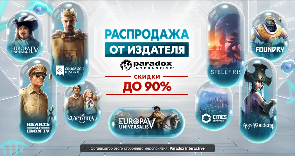 Издатель Paradox Interactive запустив в сервісі Steam розпродаж, який триватиме до 15 травня 20:00 за московським часом. Повний список знижок можна знайти на сторінці акції.