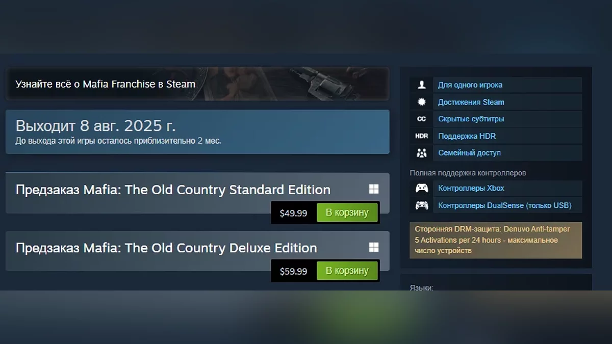 Mafia: The Old Country від студії Hangar 13 офіційно отримає антипіратську захист Denuvo. Підтвердження можна знайти на сторінці гри в Steam.