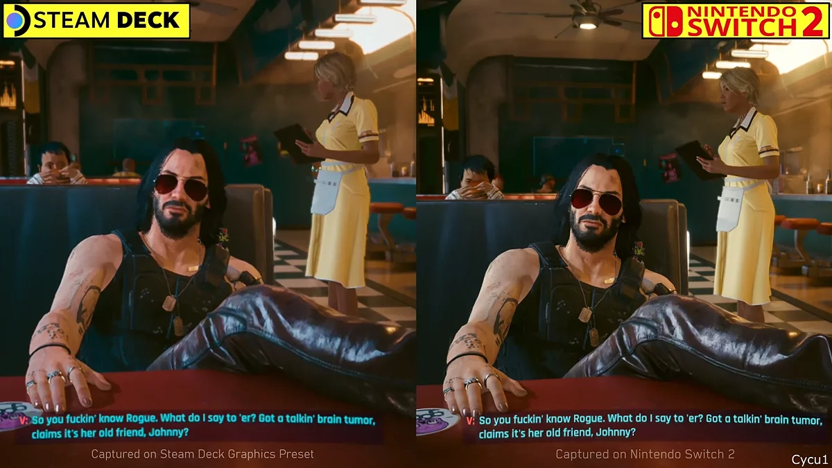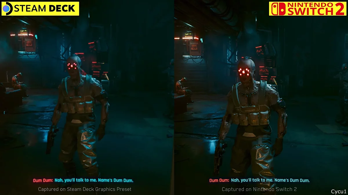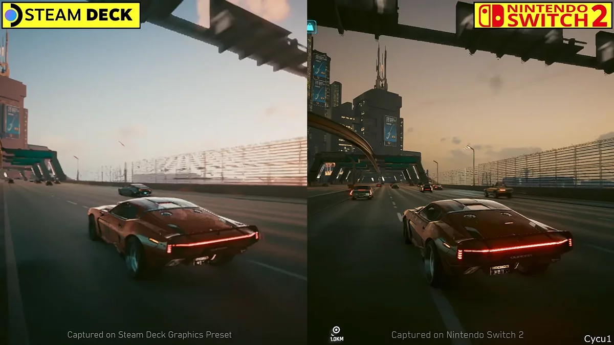 Ютубер Cycu1 опублікував 40-хвилинне відео зі порівнянням комп'ютерної версії Cyberpunk 2077, запущеної на Steam Deck, з версією для консолі Nintendo Switch 2.