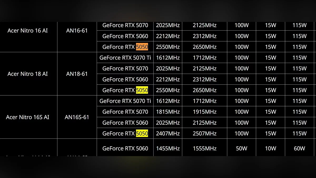 До офіційного представлення NVIDIA в мережу потрапили специфікації мобільної відеокарти GeForce RTX 5050. Інформація з'явилася не через витоки, а прямо на сайті виробника ноутбуків Acer у розділі характеристик готуючих моделей лінійки Nitro. Згідно з даними Acer, RTX 5050 буде пропонуватися в п'яти різних конфігураціях, що відрізняються рівнем енергоспоживання (TGP) та максимальною тактовою частотою.