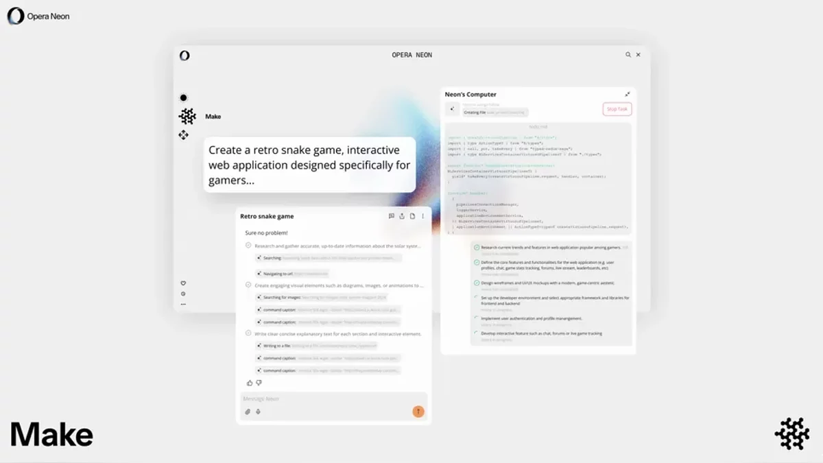Компанія Opera представила тестову версію нового браузера Neon, позиціонуючи його як платформу для «агентного» взаємодії з інтернетом. На відміну від стандартних браузерів, Neon робить ставку на три вбудовані модулі ШІ, здатні не лише шукати інформацію, але й виконувати дії від імені користувача.