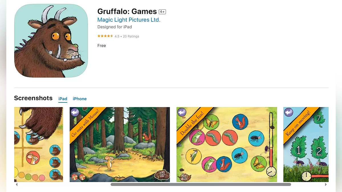 - Gruffalo: Games — номіноване на премію BAFTA освітнє додаток з 6 міні-іграми (завантажити безкоштовно);
