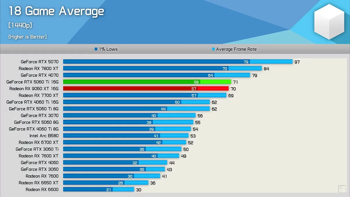 В Full HD, в середньому по 18 іграм, RX 9060 XT відстала від основного конкурента GeForce RTX 5060 Ti 16 ГБ на 6%. При цьому вона виявилася на 4% швидшою попередньої моделі AMD — Radeon RX 7700 XT. В Quad HD розрив з RTX 5060 Ti скоротився до всього 1%. Перевага над RX 7700 XT також склала 1%, що вказує на дуже близьку продуктивність цих карт в даному роздільній здатності.