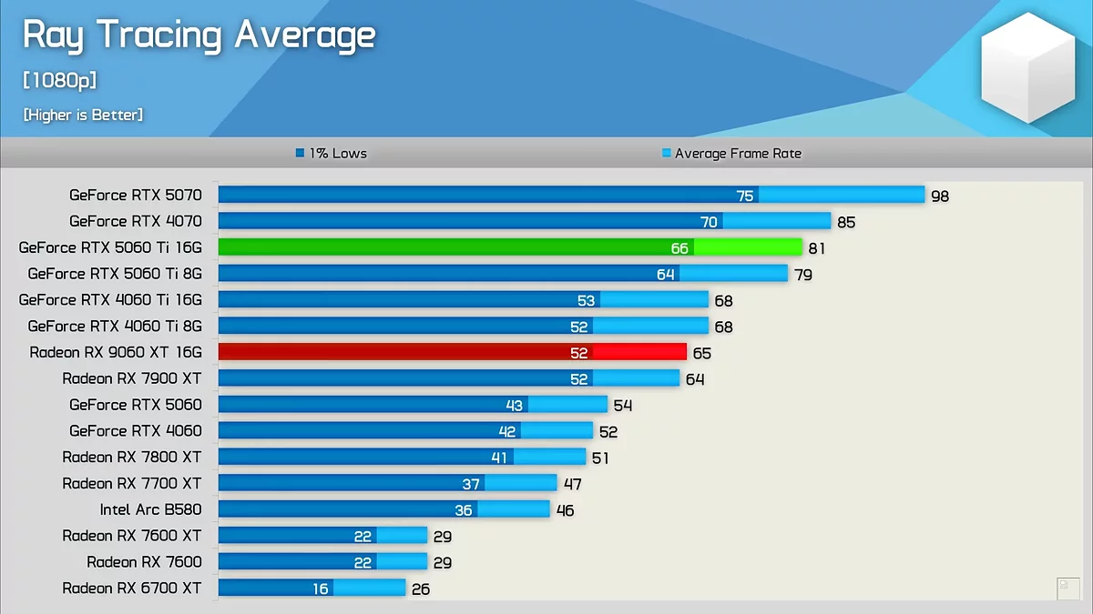 Ситуація змінилася при включенні трасування променів. У семи протестованих проєктах на налаштуваннях Full HD з RT новинка від AMD поступилася RTX 5060 Ti вже на суттєві 20%. Незважаючи на відставання в RT, оглядачі Hardware Unboxed відзначили Radeon RX 9060 XT як найбільш привабливе бюджетне рішення на даний момент, за умови її доступності за рекомендованою ціною в $350 (приблизно 27 000 гривень). За їхніми оцінками, за ці гроші карта пропонує збалансовану ігрову продуктивність як для 1080p, так і для 1440p. Особливо підкреслюється достатній обсяг відеопам'яті (16 ГБ) для цих роздільних здатностей.