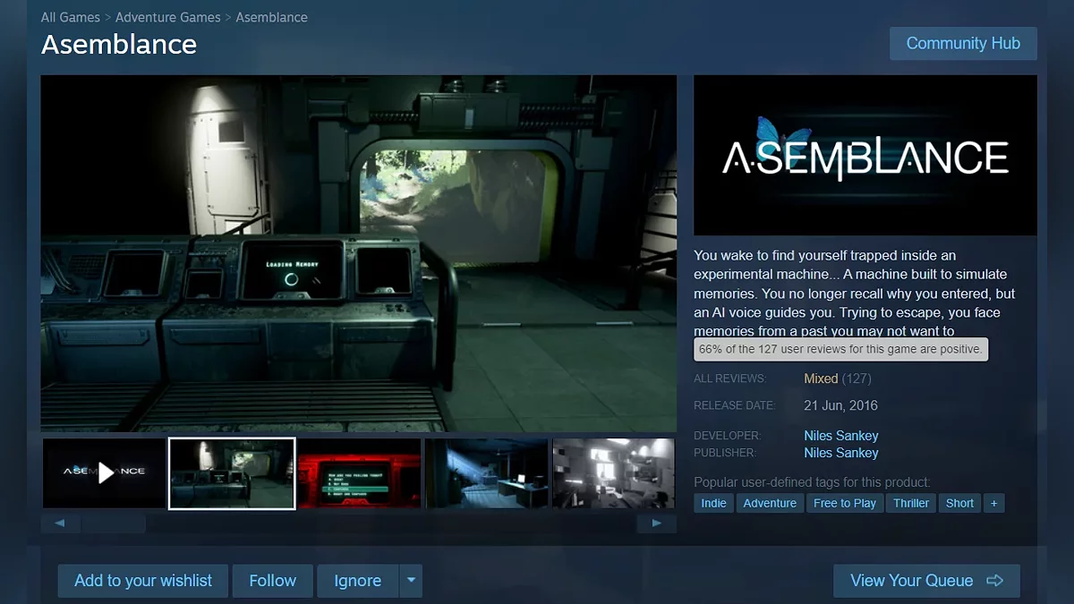 Asemblance описується як психологічний трилер від першої особи, в якому персонаж опиняється замкненим всередині експериментальної машини, здатної симулювати спогади.