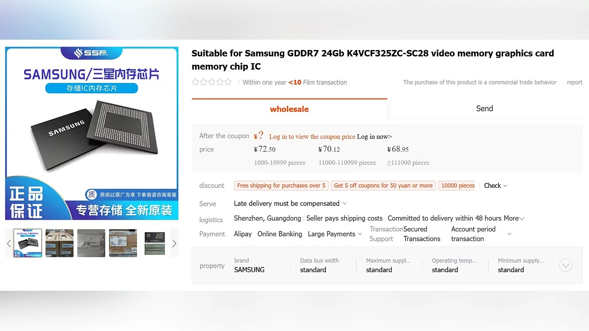 На одному з китайських торгових майданчиків несподівано з'явилися вільні модулі пам'яті Samsung GDDR7 моделі K4VCF325ZC-SC28. Їх особливість — нестандартний об'єм 3 ГБ на чип, що вдвічі більше типових для відеокарт 24-гігабітних кристалів. Ціна за штуку починається від $10.