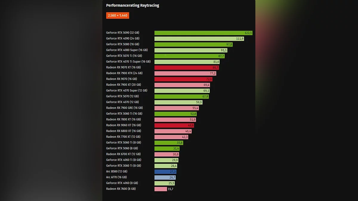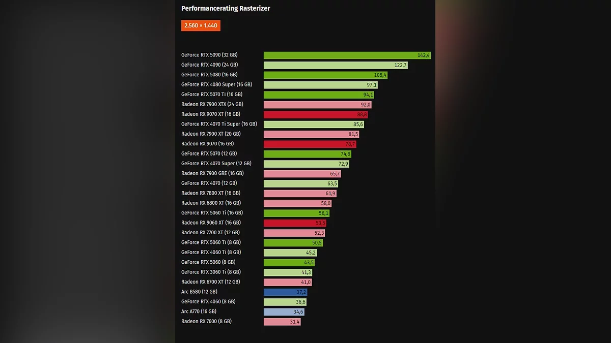 У роздільній здатності 1440p (WQHD) без використання рейтрейсинга абсолютне першість утримує NVIDIA GeForce RTX 5090. Новий флагман випередив минуле покоління (RTX 4090) приблизно на 16%, а молодшу модель RTX 5080 — на 35%. Примітно, що попередній топ AMD, Radeon RX 7900 XTX, показав результат всього на 2% гірший за нову RTX 5070 Ti і навіть на 4% обігнав новинку RX 9070 XT від «червоних».