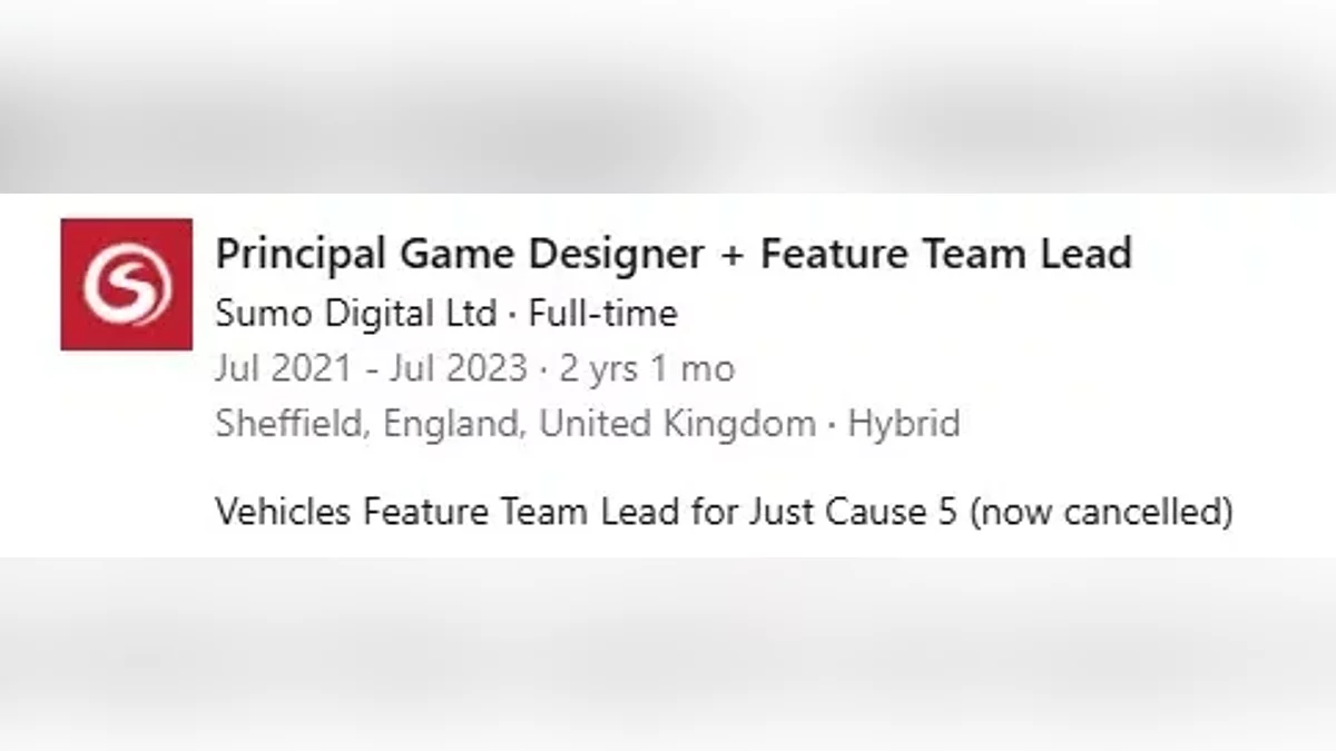 Як виявилося, Just Cause 5 знаходилася в розробці, але була скасована на етапі активного виробництва. Про це стало відомо завдяки профілю одного з розробників зі студії Sumo Digital на LinkedIn, де вказано, що він працював над Just Cause 5 як керівник команди, відповідальної за транспортні засоби. Судячи з термінів його роботи (з липня 2021 по липень 2023), проект був закритий приблизно в кінці цього періоду.