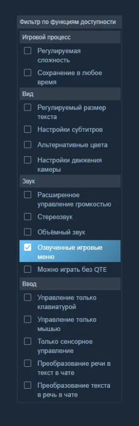 Користувачі тепер можуть легко знайти ігри з підтримкою конкретних опцій, таких як субтитри, регульована складність, налаштування субтитрів, об'ємний звук, управління тощо.