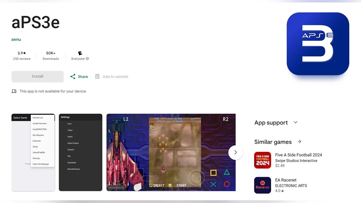 Емулятор aPS3e заснований на вихідному коді RPCS3 і оптимізований спеціально під мобільні пристрої на базі Android. Стабільна робота ігор залежить від продуктивності смартфона. Рекомендується 12 ГБ оперативної пам'яті.