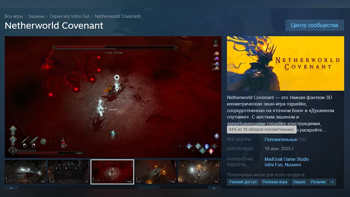 На PC в ранньому доступі вийшов новий рольовий екшен під назвою Netherworld Covenant, виконаний у стилі темного фентезі з ізометричною камерою та елементами рогалика. В Steam перші відгуки позитивні. На момент написання новини проект має рейтинг 94%.