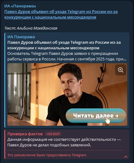 Зокрема, платформа вперше використала цю функцію щодо сатиричного видання «ІА Панорама», яке опублікувало жартівливу новину про вихід месенджера з Росії. Модератори Telegram відзначили пост повідомленням, що інформація не відповідає дійсності.
