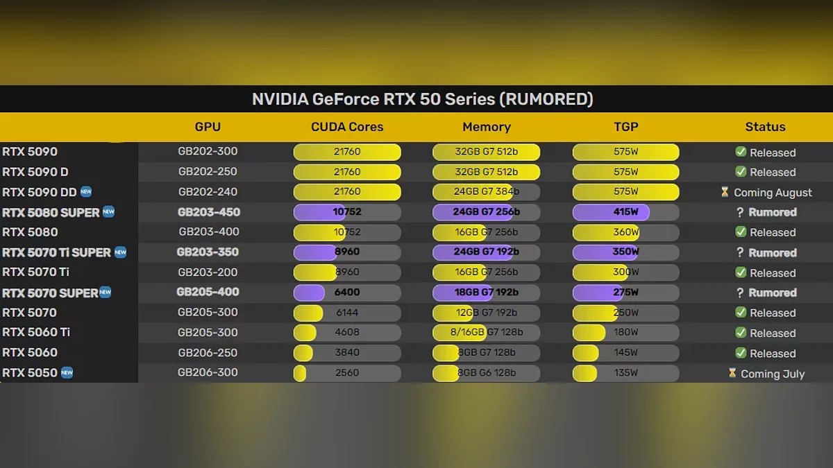 Поява моделі очікується ближче до кінця року або на початку наступного — за аналогією з 9-місячним інтервалом між RTX 4070 та RTX 4070 Super. Інсайдер також згадує про роботу над RTX 5060 з потенційно збільшеною пам'яттю (12 ГБ або навіть 16 ГБ), а також більш потужні моделі серії Super (RTX 5070 Ti SUPER, RTX 5080 SUPER з TGP 415 Вт), але їхня доля поки що менш ясна.