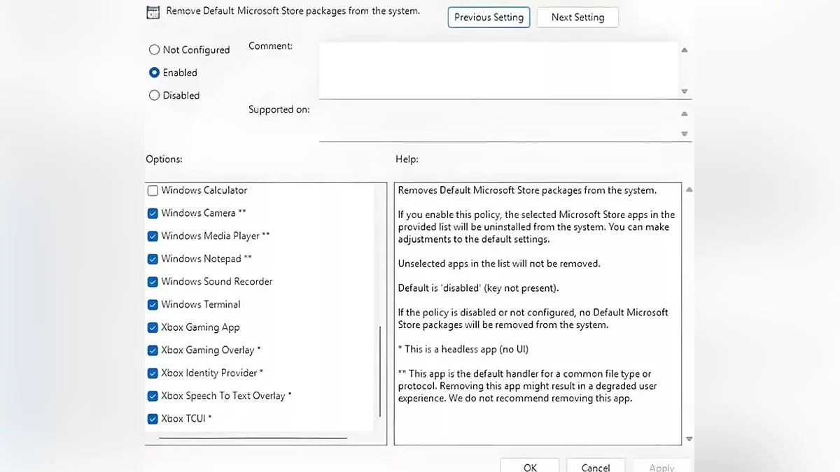 Інструмент буде розташований за шляхом: Конфігурація комп'ютера -> Адміністративні шаблони -> Компоненти Windows -> Розгортання пакетів додатків. Політика називається «Видалення стандартних пакетів Microsoft Store». Користувач просто відзначає галочками непотрібні програми, і система очищається після застосування налаштувань. Подібні налаштування можуть з'явитися і в більш ранньому оновленні 24H2, але будуть за замовчуванням приховані.