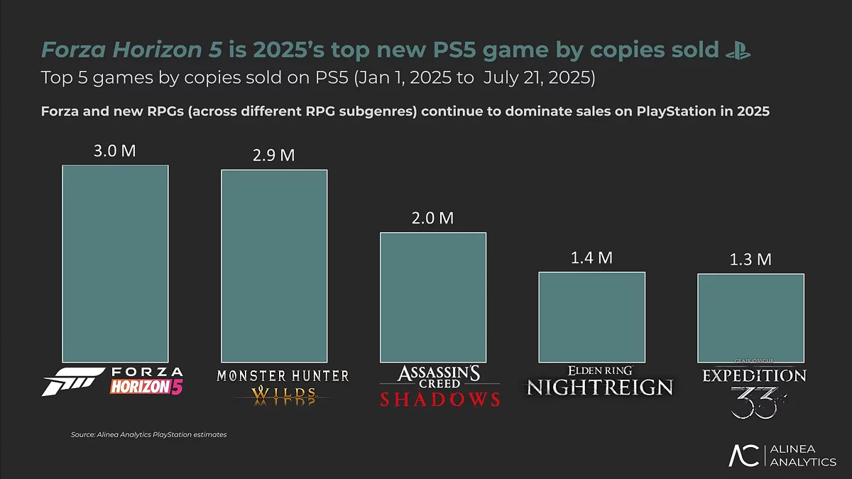 За даними аналітиків, Microsoft вдалося продати 3 млн копій Forza Horizon 5 на консолі Sony. На другій позиції розташувалася Monster Hunter Wilds (2,9 млн копій), на третій — Assassin's Creed Shadows (2 млн копій). Четверту стрічку зайняла Elden Ring Nightreign (1,4 млн копій), на п’ятій опинилася Clair Obscur: Expedition 33 (1,3 млн копій). Портал Alinea Analytics також повідомив, що нещодавній PS5-ексклюзив Death Stranding 2 розійшовся тиражем в мільйон копій за 25 днів.