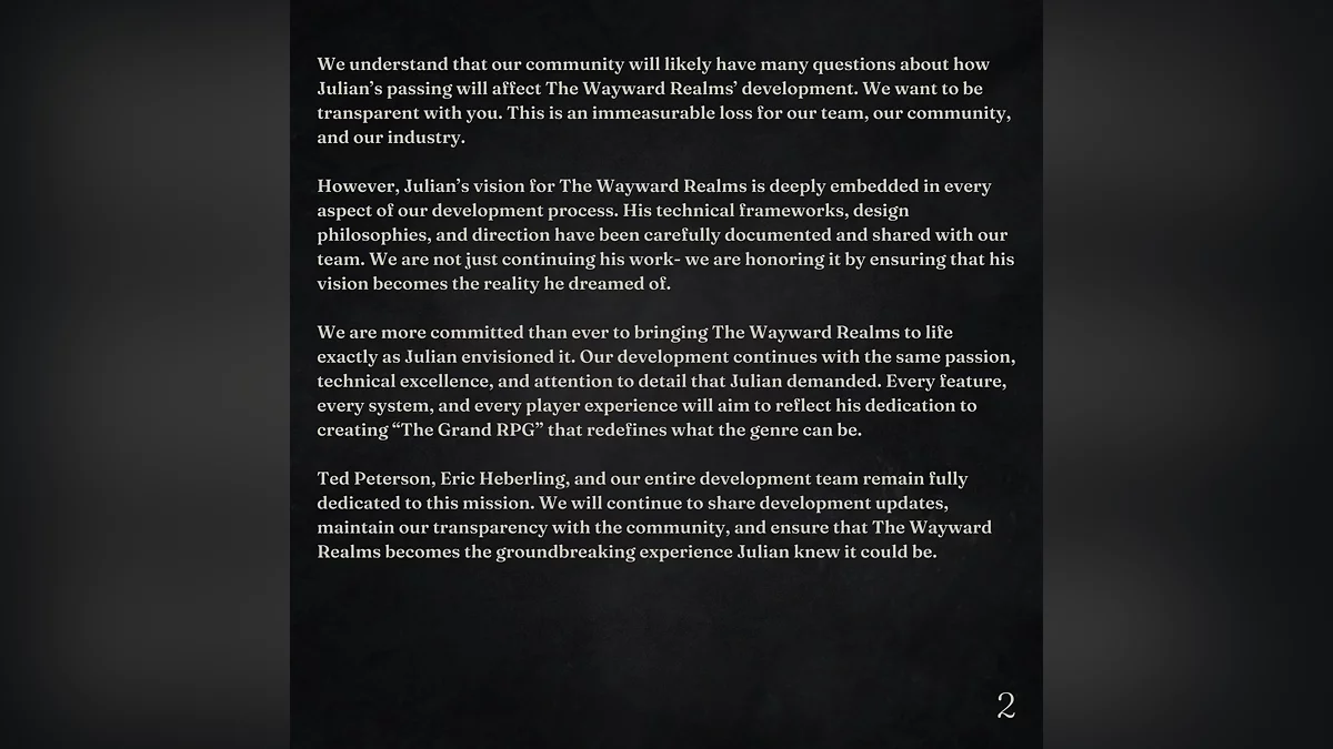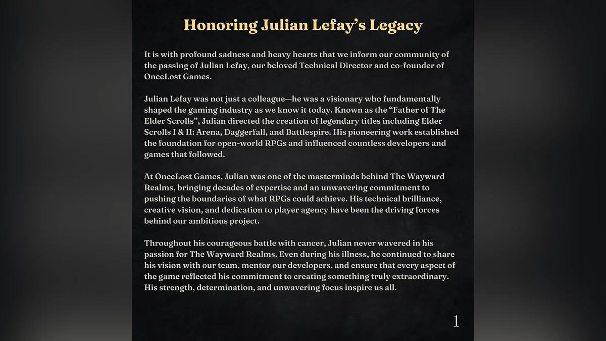 Печальною новиною поділились співробітники студії OnceLost Games, де ЛеФей працював над фентезійною рольовою грою The Wayward Realms. На минулому тижні він офіційно покинув команду, щоб проводити більше часу в колі близьких.