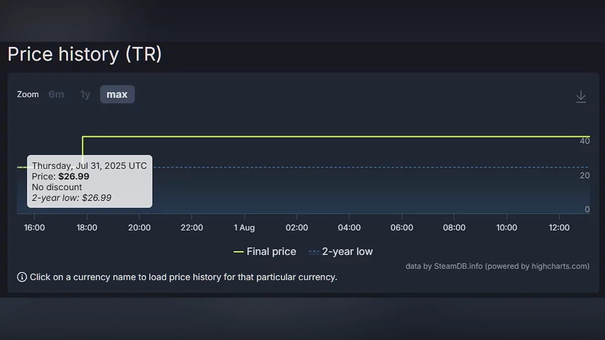 Схожа помилка сталася в турецькому регіоні Steam. За даними сервісу SteamDB, перші дві години гру можна було купити за 27 доларів (2160 рублів). Пізніше ціну підвищили до 45 доларів (3600 рублів).